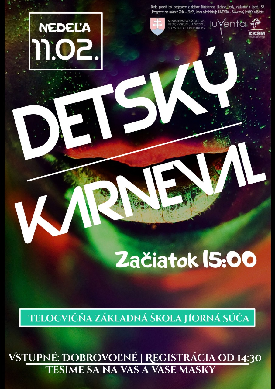 Pozývame vás na detský karneval, ktorý sa uskutoční v telocvičňi Základnej školy M. Rešetku v Hornej Súči dňa 11.2.2018 o 15:00. Začiatok registrácie o 14:30. Prosíme deti, aby sa karnevalu zúčastnili iba vo vlastnoručne, domavyrobených maskách. Ďakujeme.
